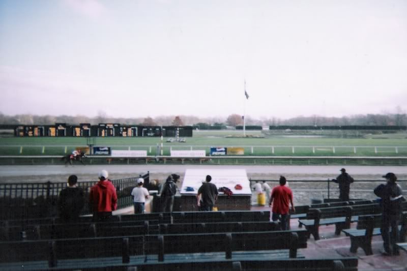 I wanted to see Hard Spun in person since I knew the meet was going to end and he was going to prep in the Mid-West for the Derby. Unfortunately, I had math class (ugh!), but I was doing well in the class, so I left early and snuck off to DP (If you are wondering I passed the class with flying colors). When we got there, my mom and I accadently went through the slots area. I should note, not only was it my first time to DP, it was hers as well. Luckly we didn't get caught, (although my first and only time there alone, I went through the slots and well... got carded.) When we got to the actual track, I was in awe. Okay Delaware is not the biggest track in the world, and it was a bit cloudy and gloomy. Still I was amazed, but that could be because I was a track rookie.